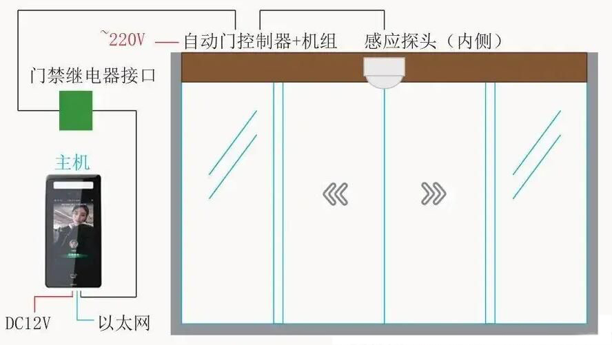 紅外傳感器對(duì)物體存在進(jìn)行反應(yīng),不管人員移動(dòng)與否,只要處于傳感器的掃描范圍內(nèi),它都會(huì)反應(yīng)即傳出觸點(diǎn)信號(hào)。缺點(diǎn)是紅外傳感器的反應(yīng)速度較慢,適用于有行動(dòng)遲緩的人員出入的場(chǎng)所。但由于場(chǎng)所的不同性質(zhì),需要搭配不同的開(kāi)啟方式(比如:感應(yīng)開(kāi)門、人臉識(shí)別開(kāi)門、密碼/指紋開(kāi)門等)。今天我們重點(diǎn)來(lái)說(shuō)明一下自動(dòng)門通過(guò)連接門禁控制器來(lái)實(shí)現(xiàn)開(kāi)關(guān)門的方法,為了更方便地讓您了解。我們采用圖文方式進(jìn)行說(shuō)明,自動(dòng)門如何連接門禁控制器(自動(dòng)門與門禁控制器的接法)如下:
